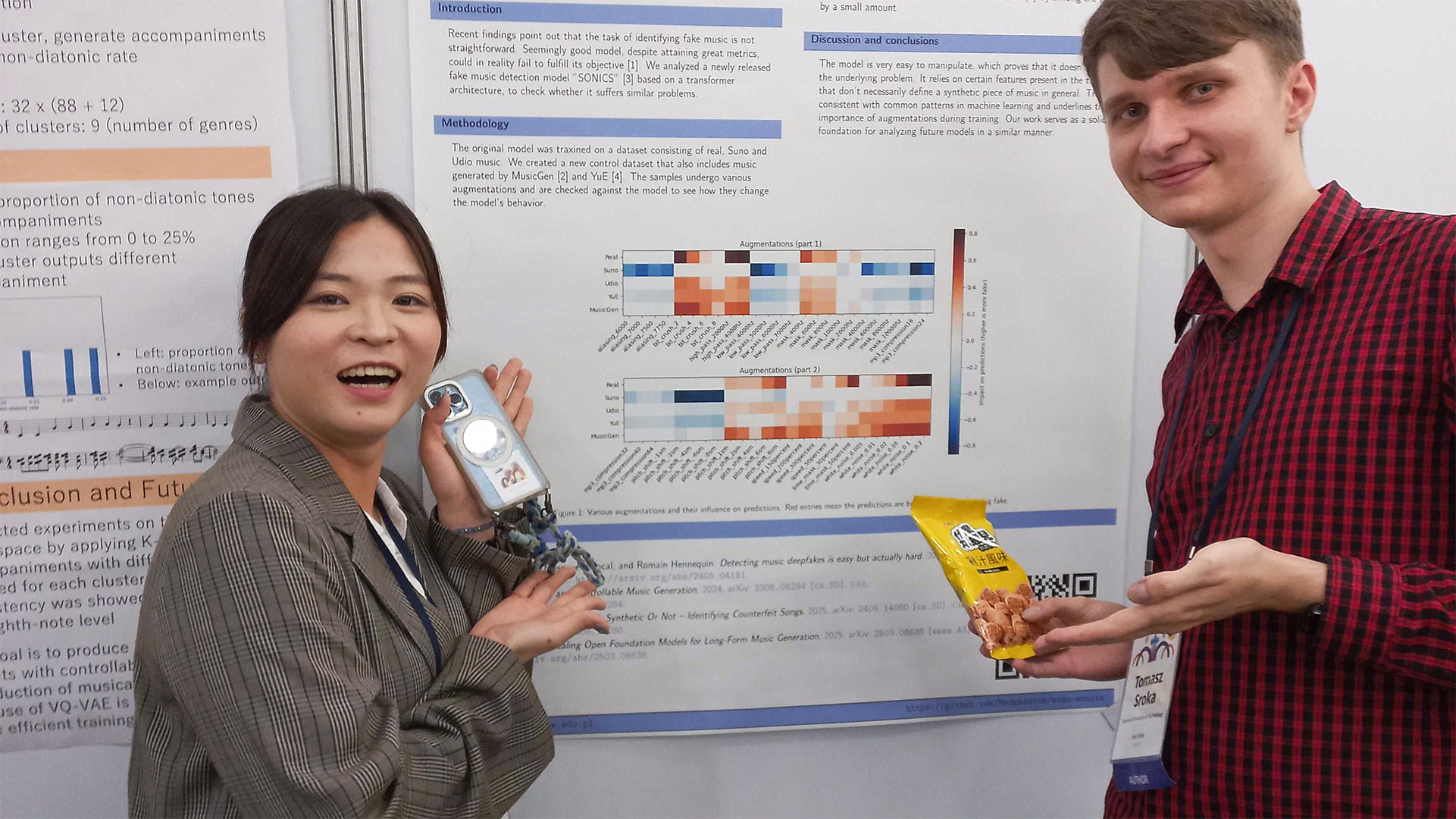 Dzięki niej nasz student inż. Tomasz Sroka wziął udział w konferencji ISMIR 2025 w Daejeon w Korei – najważniejszym na świecie wydarzeniu naukowym poświęconym sztucznej inteligencji w muzyce. Tomasz zaprezentował tam pracę „Evaluating Fake Music Detection Performance Under Audio Augmentations” zespołu z Instytut Informatyki PW, dotyczącą odporności modeli wykrywających muzyczne deepfake’i. W badaniu pokazano, że nawet najnowsze detektory tracą skuteczność już przy niewielkich zniekształceniach sygnału (augmentacjach audio) oraz mają bardzo ograniczoną zdolność uogólniania na nieznane generatory muzyki. Pracami kierował dr inż. Mateusz Modrzejewski.